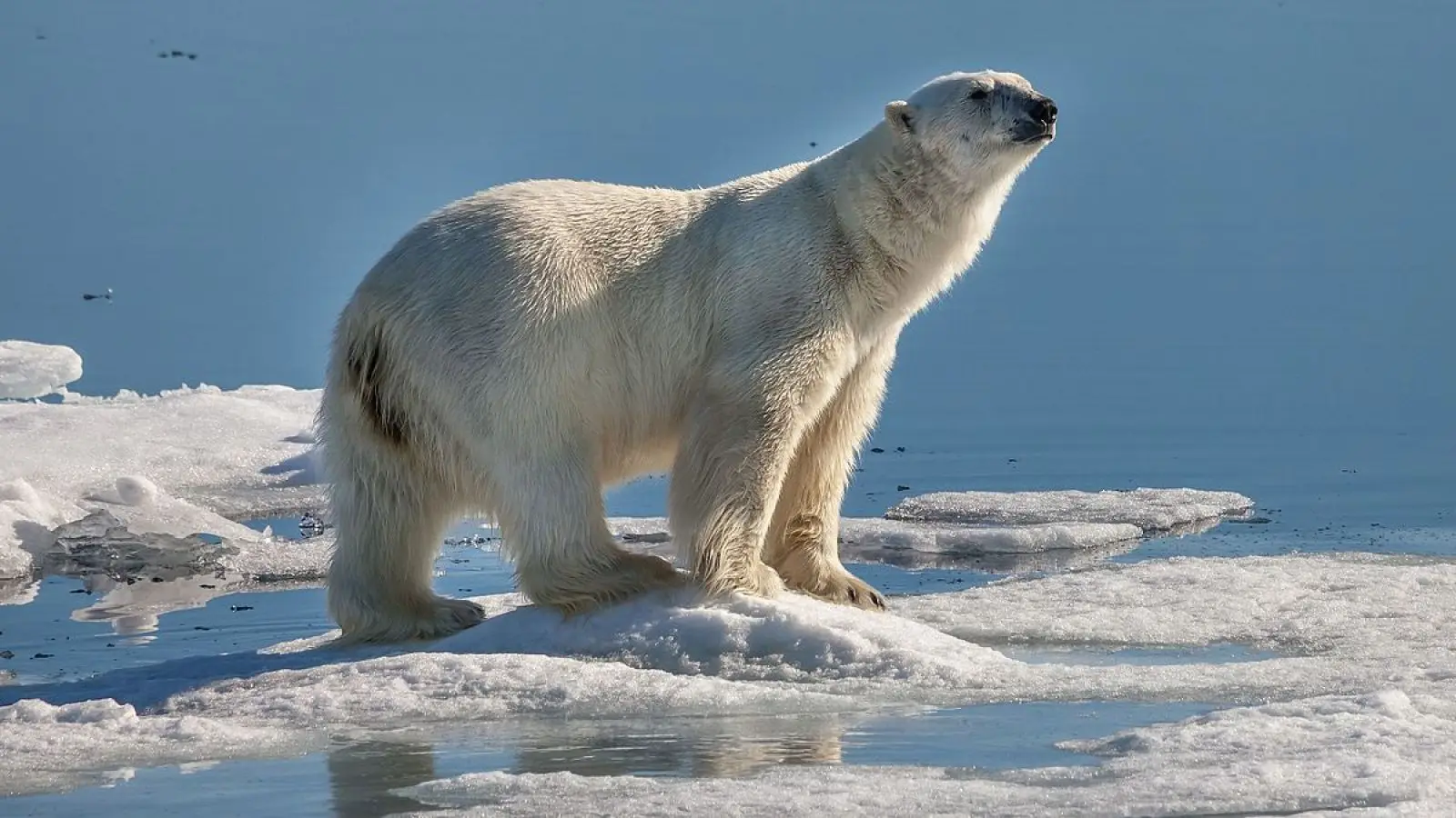 Білий ведмідь знаходиться під загрозою через танення льоду, яке ускладнює полювання і скорочує його природне середовище існування.