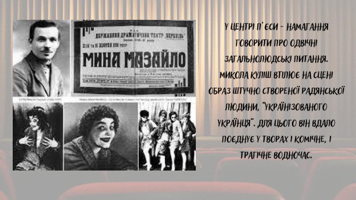 Мина Мазайло є головним героєм однойменної п’єси, і водночас через нього розкривається конфлікт між прагненням «бути як усі» та страхом втратити власне коріння, адже, з одного боку, він боїться українського походження, а з іншого — прагне соціального успіху будь-якою ціною.