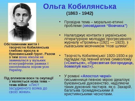 Ольга Кобилянська — українська письменниця модерністка, яка відома творами «Царівна» та «Земля».