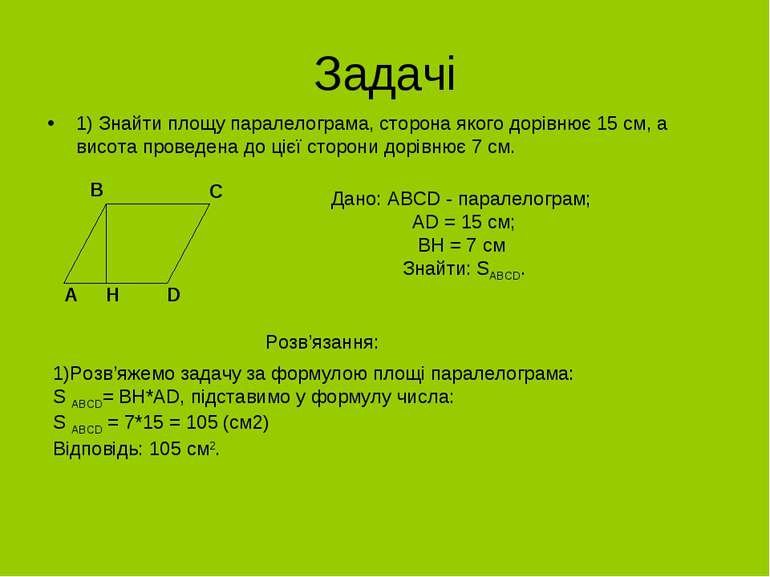 Задача 1: Основа паралелограма — 10 см, висота — 6 см. Знайти площу.