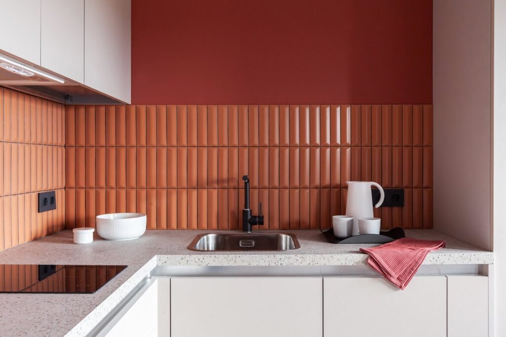 Угловая кухня може мати яскраві елементи, наприклад фартух або ручки, і це додає інтер’єру індивідуальності.